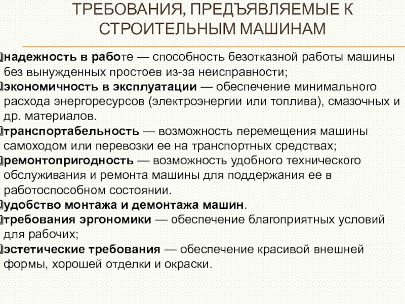 Слайд 18ТРЕБОВАНИЯ, ПРЕДЪЯВЛЯЕМЫЕ К СТРОИТЕЛЬНЫМ МАШИНАМ