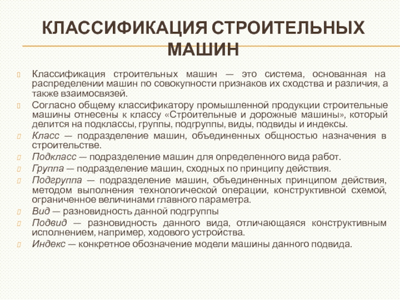 Согласно общему классификатору промышленной продукции строительные машины отнесены к классу «Строительные и дорожные машины», который делится на подклассы, группы, подгруппы, виды, подвиды и индексы.