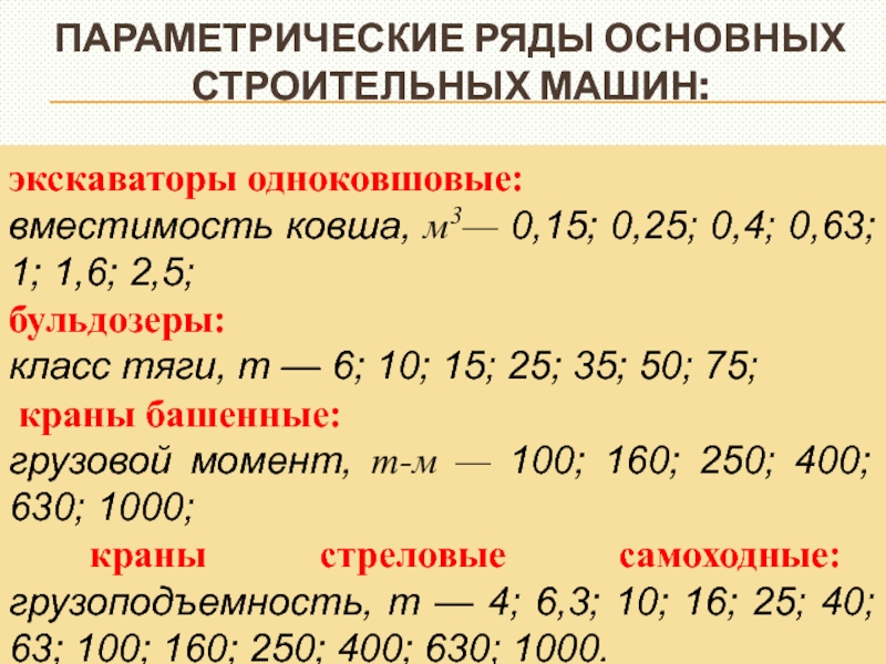 Слайд 8Параметрические ряды основных строительных машин: