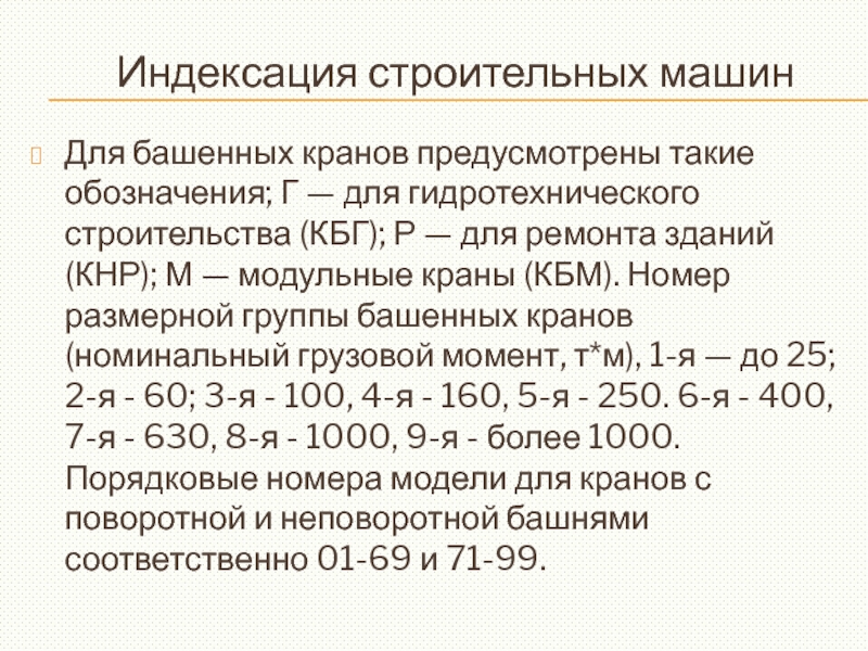 (КНР); М — модульные краны (КБМ). Номер размерной группы башенных кранов (номинальный грузовой момент, т*м), 1-я — до 25; 2-я - 60; 3-я - 100, 4-я - 160, 5-я - 250. 6-я - 400, 7-я - 630, 8-я - 1000, 9-я - более 1000. Порядковые номера модели для кранов с поворотной и неповоротной башнями соответственно 01-69 и 71-99.