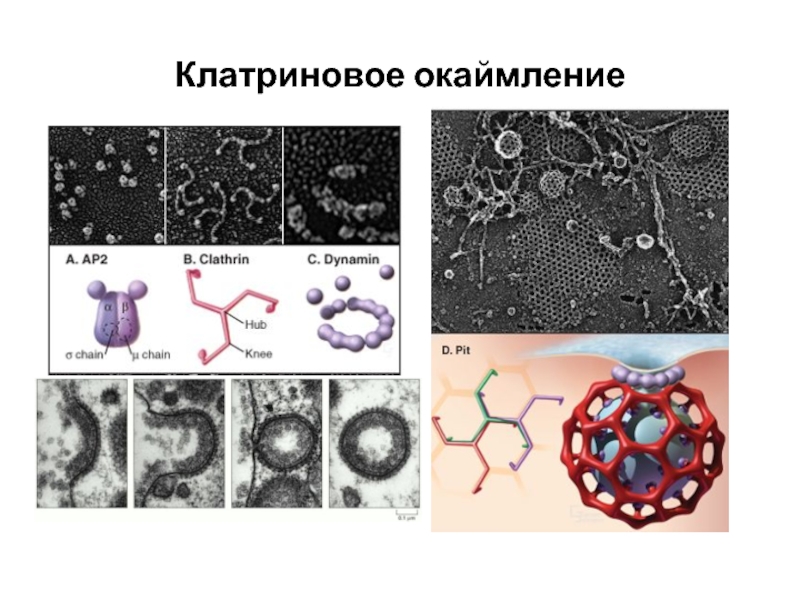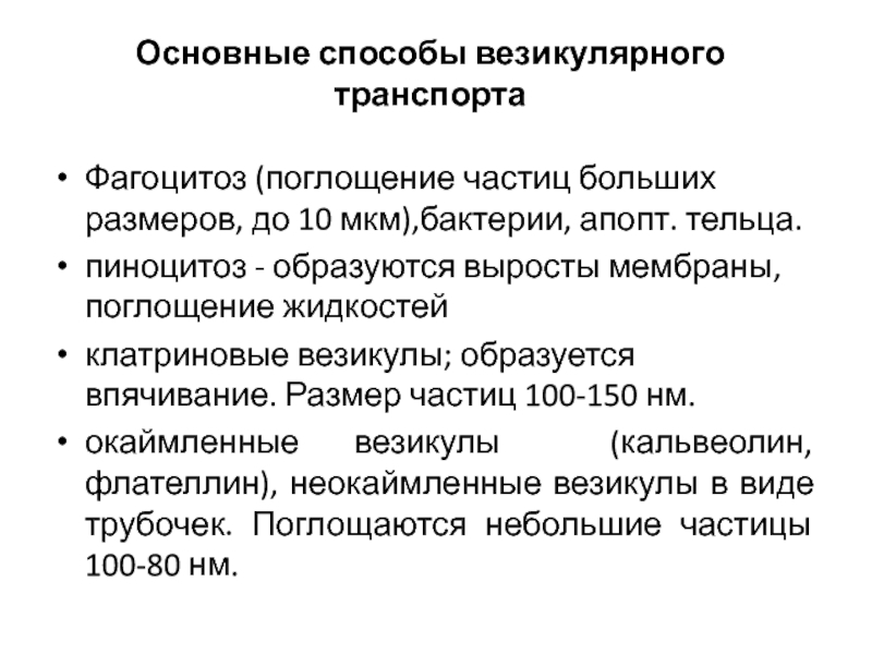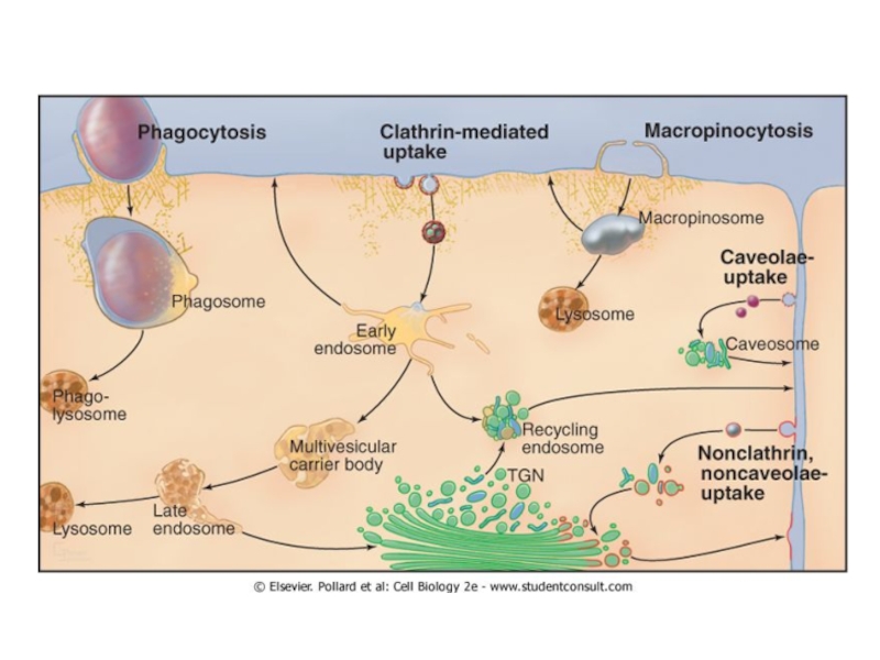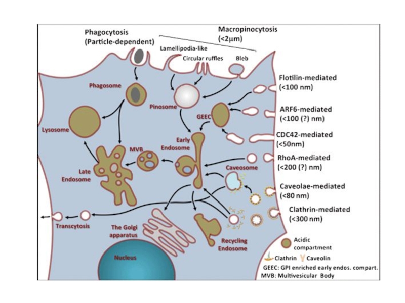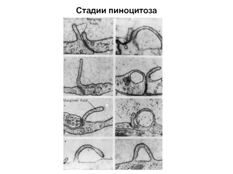 окаймленные везикулы (кальвеолин, флателлин), неокаймленные везикулы в виде трубочек. Поглощаются небольшие частицы 100-80 нм.
