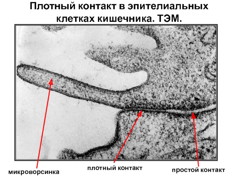 Слайд 19Плотный контакт в эпителиальных клетках кишечника. ТЭМ.