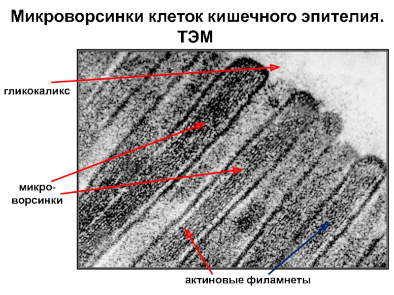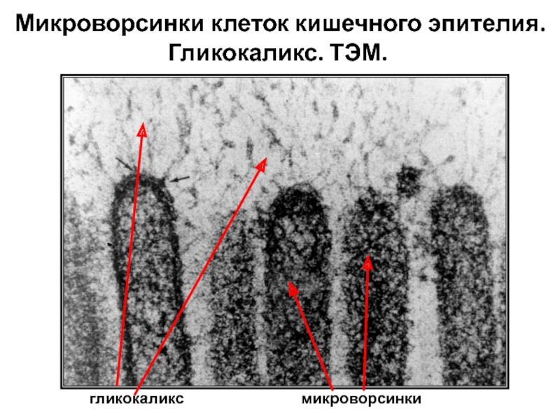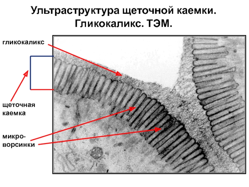 Слайд 4Ультраструктура щеточной каемки. Гликокаликс. ТЭМ.