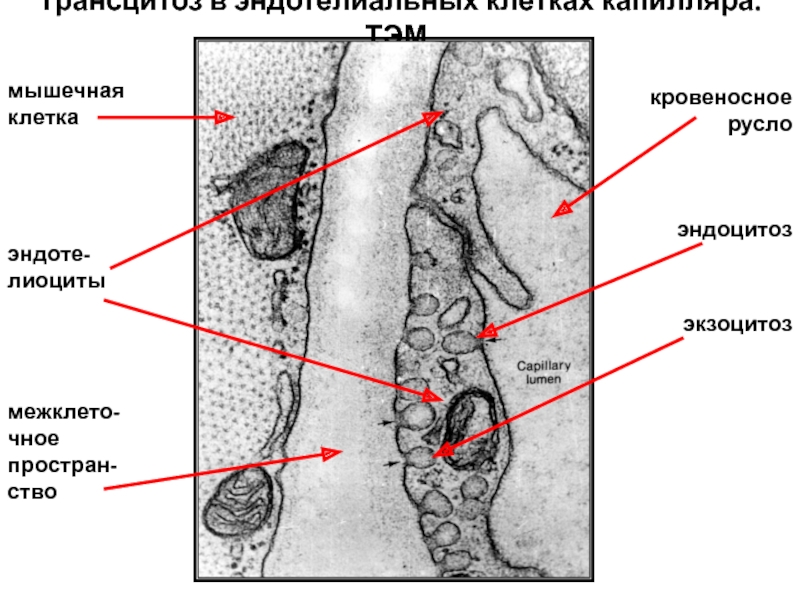 Трансцитоз в эндотелиальных клетках капилляра. ТЭМ.