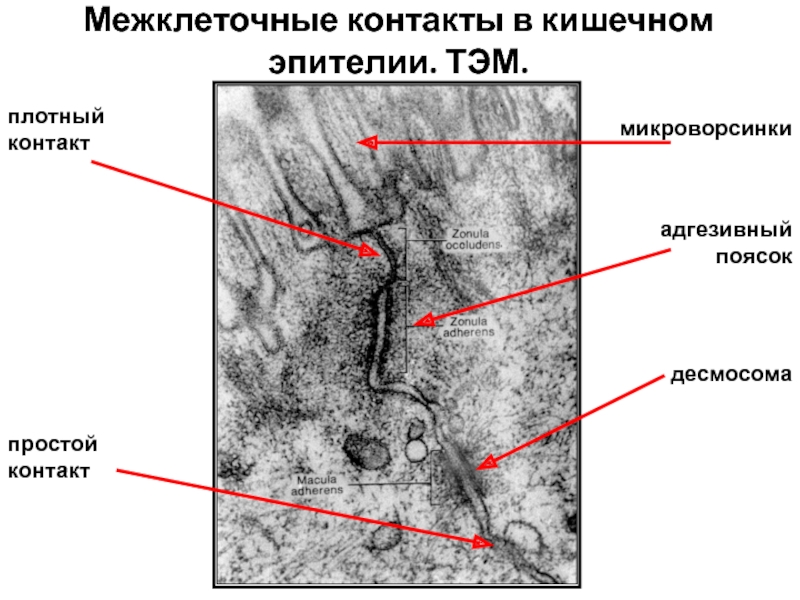 Слайд 29Межклеточные контакты в кишечном эпителии. ТЭМ.