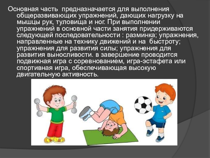 Слайд 5Основная часть предназначается для выполнения общеразвивающих упражнений, дающих нагрузку на