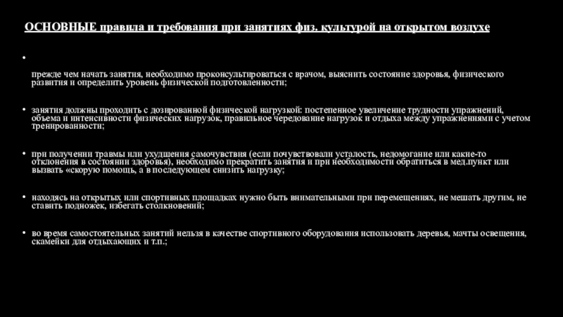 Слайд 5ОСНОВНЫЕ правила и требования при занятиях физ. культурой на открытом