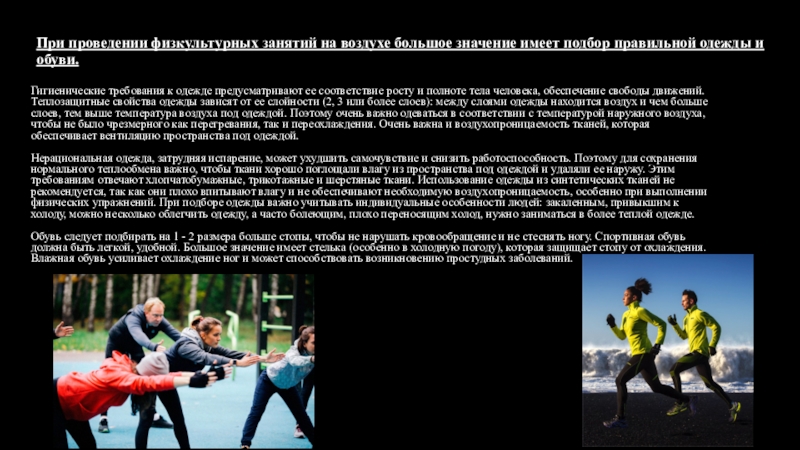 Нерациональная одежда, затрудняя испарение, может ухудшить самочувствие и снизить работоспособность. Поэтому для сохранения нормального теплообмена важно, чтобы ткани хорошо поглощали влагу из пространства под одеждой и удаляли ее наружу. Этим требованиям отвечают хлопчатобумажные, трикотажные и шерстяные ткани. Использование одежды из синтетических тканей не рекомендуется, так как они плохо впитывают влагу и не обеспечивают необходимую воздухопроницаемость, особенно при выполнении физических упражнений. При подборе одежды важно учитывать индивидуальные особенности людей: закаленным, привыкшим к холоду, можно несколько облегчить одежду, а часто болеющим, плохо переносящим холод, нужно заниматься в более теплой одежде.