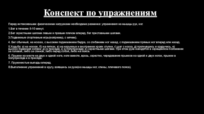 работу (то есть, перед началом интенсивных упражнений необходима разминка), успешное выполнение поставленных задач и в конце занятия приведение организма в спокойное состояние.
