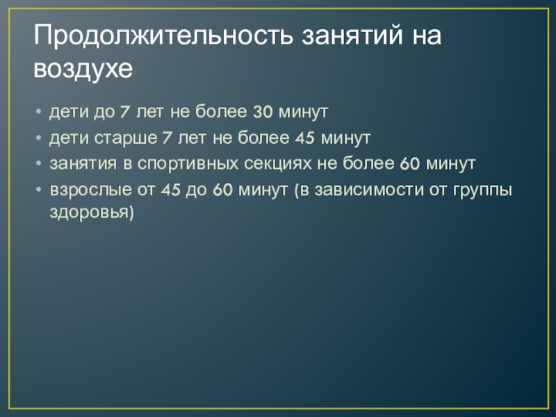 взрослые от 45 до 60 минут (в зависимости от группы здоровья)