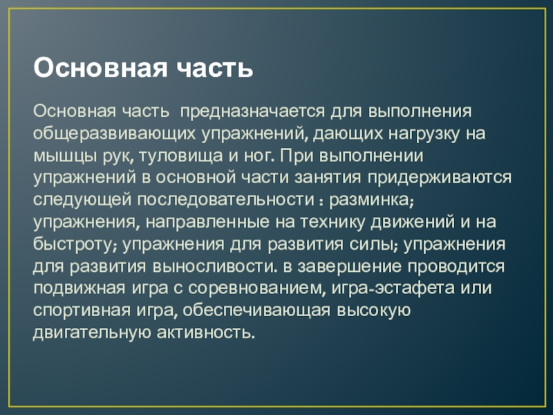 Основная часть предназначается для выполнения общеразвивающих упражнений, дающих нагрузку