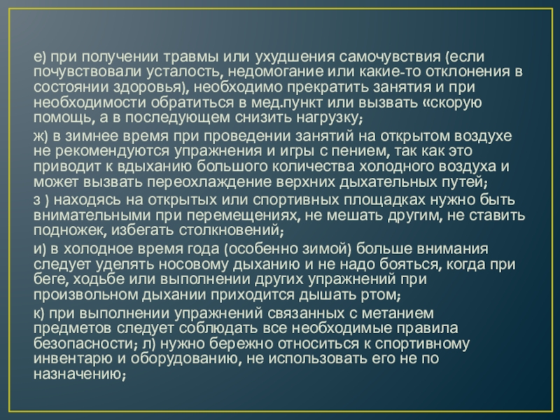 ж) в зимнее время при проведении занятий на открытом воздухе не рекомендуются упражнения и игры с пением, так как это приводит к вдыханию большого количества холодного воздуха и может вызвать переохлаждение верхних дыхательных путей;