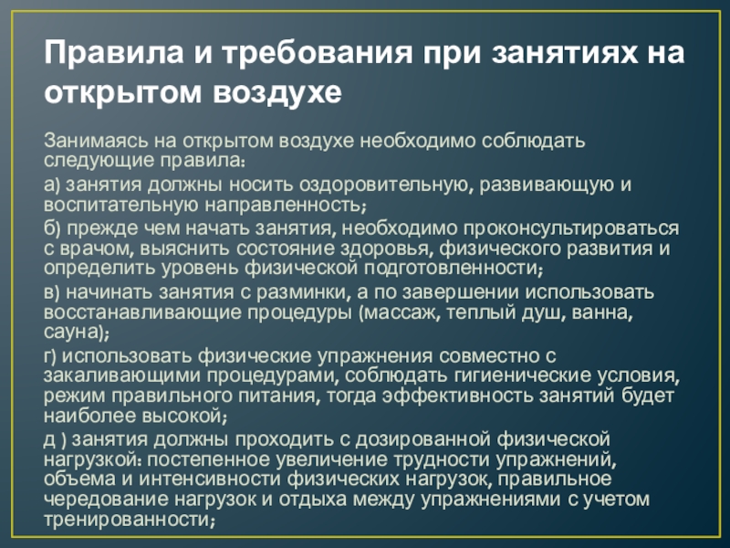 Слайд 10Правила и требования при занятиях на открытом воздухе