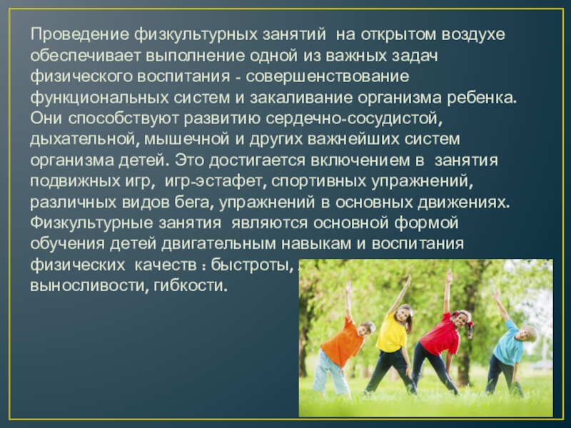Слайд 2Проведение физкультурных занятий на открытом воздухе обеспечивает выполнение одной из