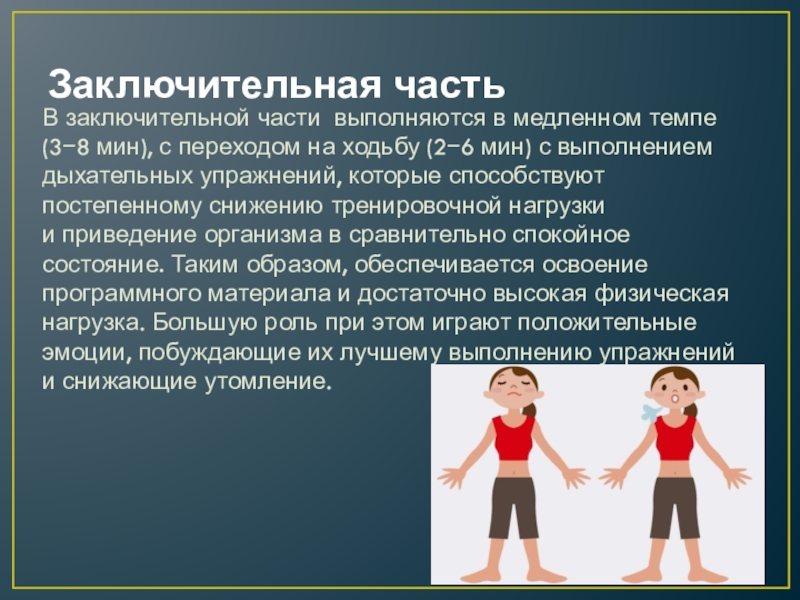 упражнений, которые способствуют постепенному снижению тренировочной нагрузки и приведение организма в сравнительно спокойное состояние. Таким образом, обеспечивается освоение программного материала и достаточно высокая физическая нагрузка. Большую роль при этом играют положительные эмоции, побуждающие их лучшему выполнению упражнений и снижающие утомление.