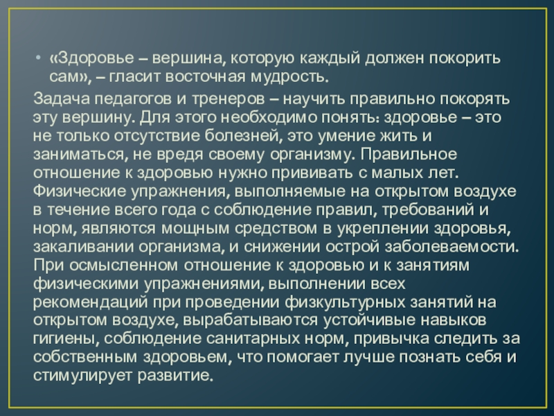 эту вершину. Для этого необходимо понять: здоровье – это не только отсутствие болезней, это умение жить и заниматься, не вредя своему организму. Правильное отношение к здоровью нужно прививать с малых лет. Физические упражнения, выполняемые на открытом воздухе в течение всего года с соблюдение правил, требований и норм, являются мощным средством в укреплении здоровья, закаливании организма, и снижении острой заболеваемости. При осмысленном отношение к здоровью и к занятиям физическими упражнениями, выполнении всех рекомендаций при проведении физкультурных занятий на открытом воздухе, вырабатываются устойчивые навыков гигиены, соблюдение санитарных норм, привычка следить за собственным здоровьем, что помогает лучше познать себя и стимулирует развитие.