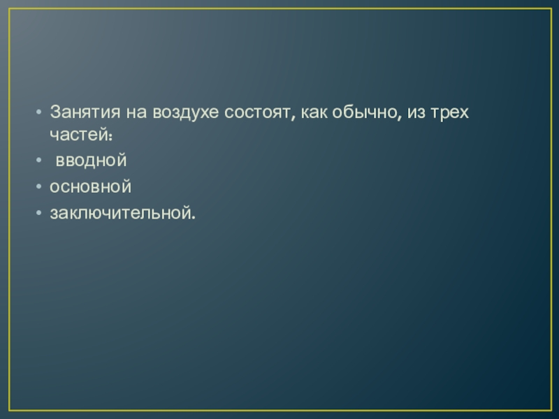 Слайд 5Занятия на воздухе состоят, как обычно, из трех частей: