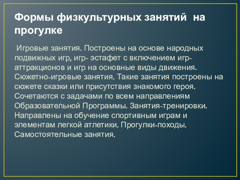 на основные виды движения. Сюжетно-игровые занятия. Такие занятия построены на сюжете сказки или присутствия знакомого героя. Сочетаются с задачами по всем направлениям Образовательной Программы. Занятия-тренировки. Направлены на обучение спортивным играм и элементам легкой атлетики. Прогулки-походы. Самостоятельные занятия.