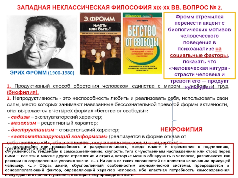 Фромм стремился перенести акцент с биологических мотивов человеческого поведения в психоанализе на социальные факторы, показать что «человеческая натура - страсти человека и тревоги его — продукт культуры».