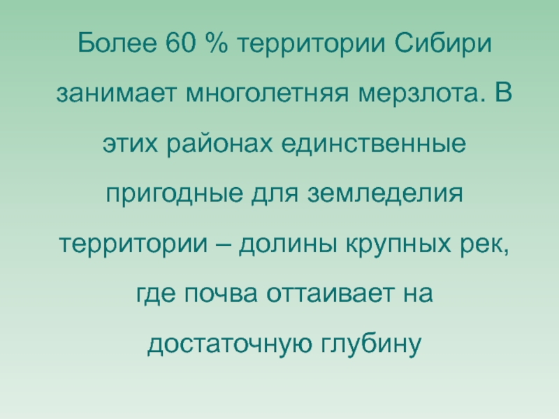 Более 60 % территории Сибири занимает многолетняя мерзлота. В этих