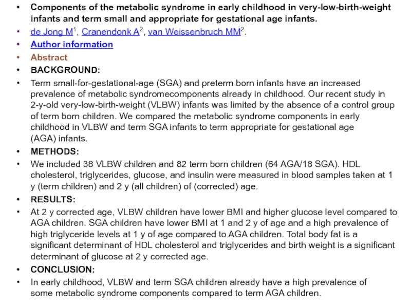 Слайд 15Components of the metabolic syndrome in early childhood in very-low-birth-weight infants and term