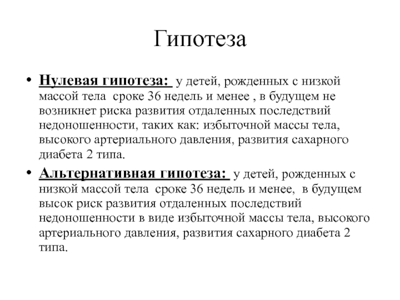 Альтернативная гипотеза: у детей, рожденных с низкой массой тела сроке 36 недель и менее, в будущем высок риск развития отдаленных последствий недоношенности в виде избыточной массы тела, высокого артериального давления, развития сахарного диабета 2 типа.