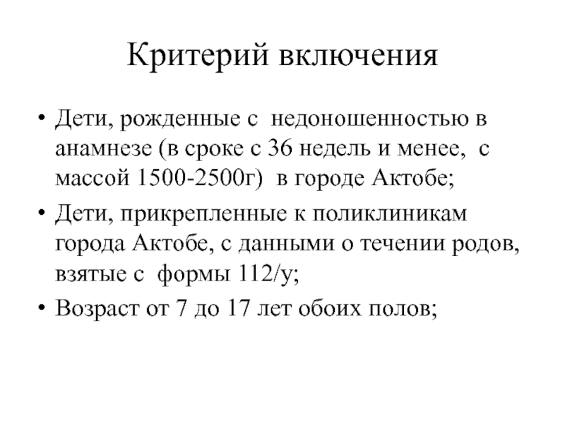 гестации 36 недель и менее, прикрепленных к городским поликлиникам и ныне проживающих в городе Актобе, в возрасте с 7 до 17 лет.