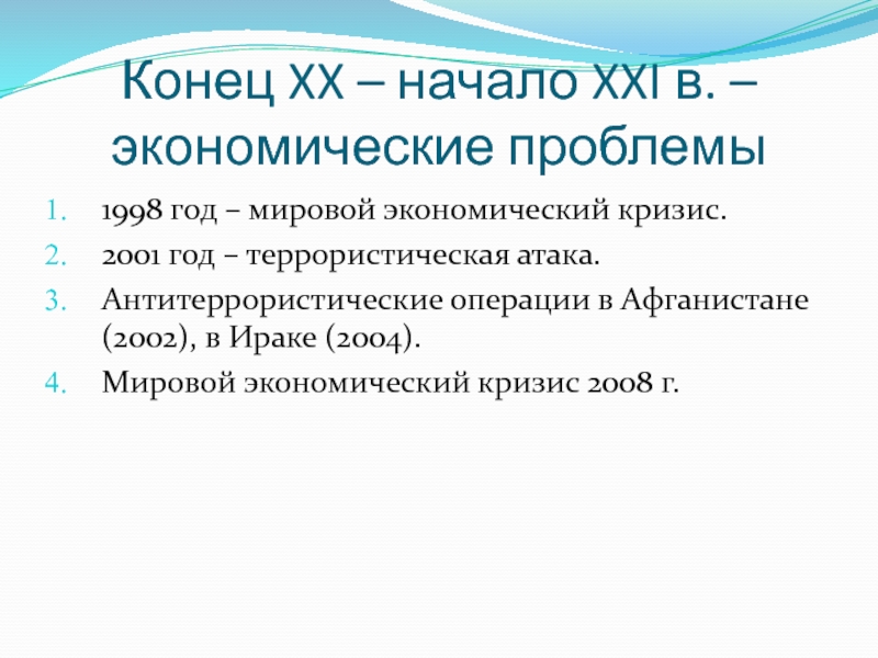 Слайд 12Конец XX – начало XXI в. – экономические проблемы