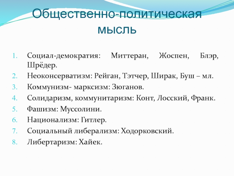 Социал-демократия: Миттеран, Жоспен, Блэр, Шрёдер.