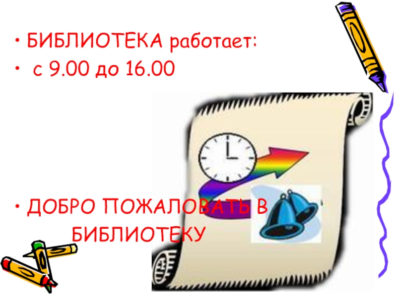 БИБЛИОТЕКА работает: с 9.00 до 16.00ДОБРО ПОЖАЛОВАТЬ В        			БИБЛИОТЕКУ