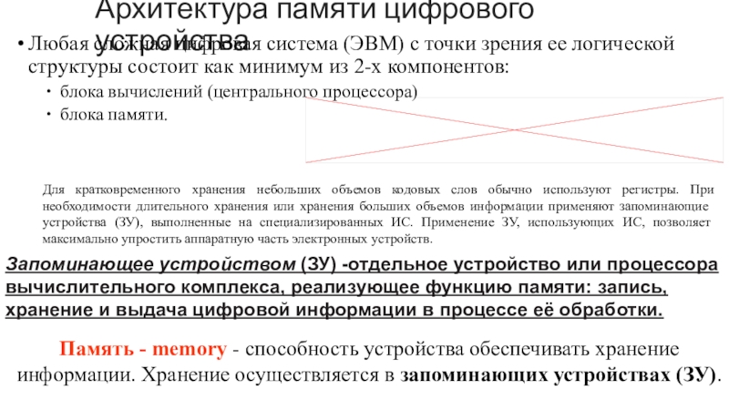 -отдельное устройство или процессора вычислительного комплекса, реализующее функцию памяти: запись, хранение и выдача цифровой информации в процессе её обработки.