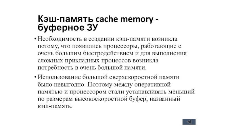 защёлки (триггер), состояние которого остаётся неизменным до тех пор, пока не будет сделана новая запись в этот элемент или не будет выключено питание. Статическая память является более дорогой и имеет высокое энергопотребление, но она имеет высокое быстродействие (единицы-десятки наносекунд) и низкую удельную плотность данных (порядка единиц Мбит на коpпус). Поэтому статическая память используется в основном в качестве буфеpной кэш-память).