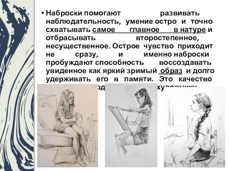 Слайд 4Наброски помогают развивать наблюдательность, умение остро и точно схватывать самое главное в натуре и отбрасывать