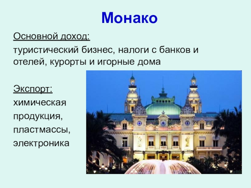 МонакоОсновной доход:туристический бизнес, налоги с банков и отелей, курорты и игорные дома Экспорт: химическая продукция, пластмассы, электроника