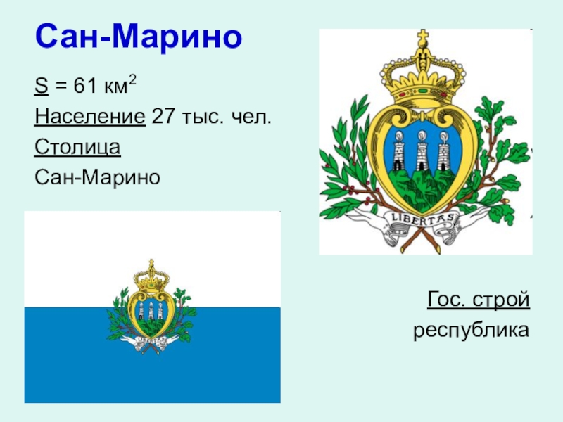 Сан-МариноS = 61 км2Население 27 тыс. чел.Столица Сан-Марино						Гос. строй республика