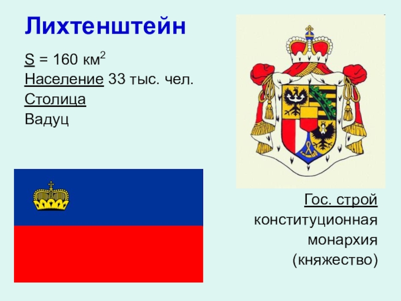 ЛихтенштейнS = 160 км2Население 33 тыс. чел.Столица Вадуц						Гос. строй конституционнаямонархия (княжество)