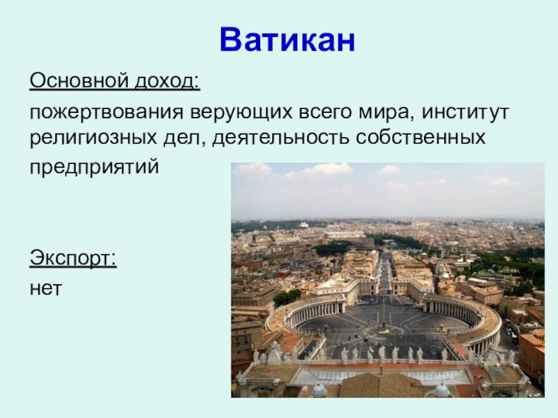ВатиканОсновной доход:пожертвования верующих всего мира, институт религиозных дел, деятельность собственных предприятий  Экспорт: нет
