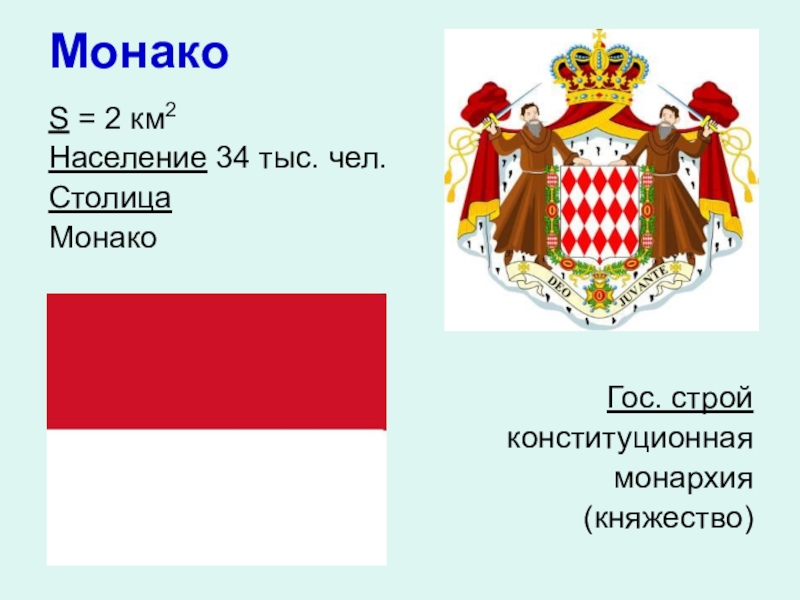 МонакоS = 2 км2Население 34 тыс. чел.СтолицаМонако						Гос. строй конституционнаямонархия (княжество)