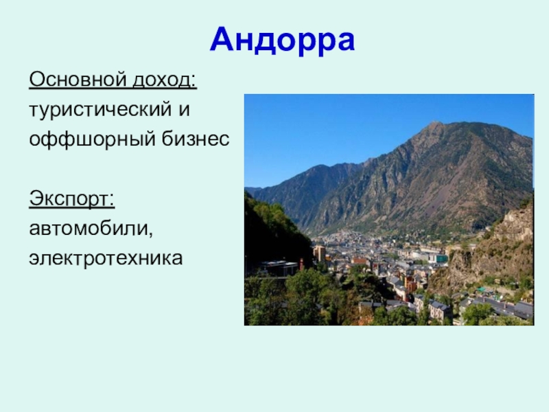 АндорраОсновной доход:туристический и оффшорный бизнесЭкспорт: автомобили, электротехника