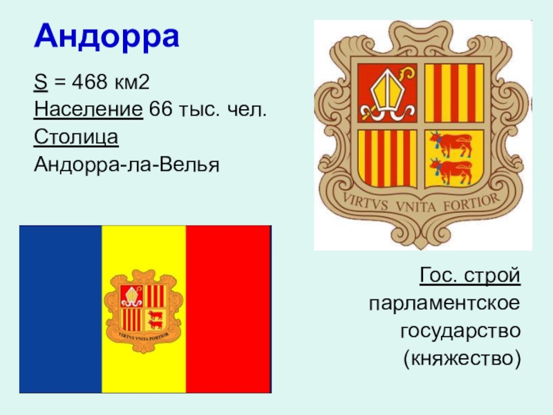 АндорраS = 468 км2Население 66 тыс. чел.Столица Андорра-ла-Велья Гос. строй парламентское государство(княжество)