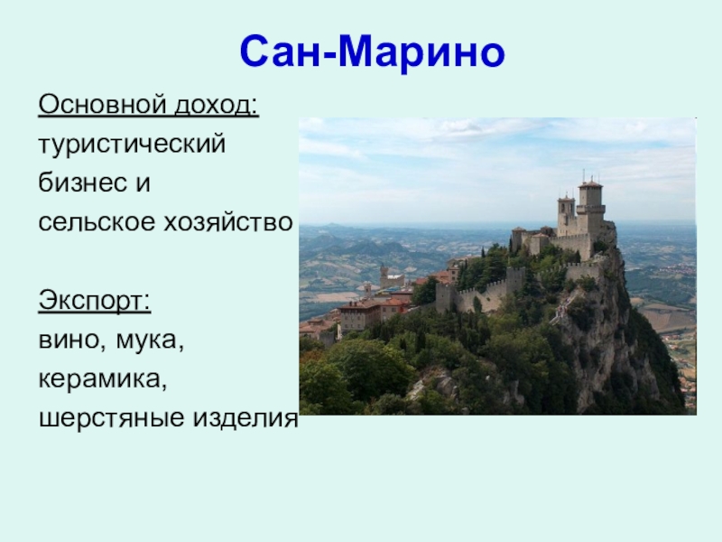 Сан-МариноОсновной доход:туристический бизнес и сельское хозяйствоЭкспорт: вино, мука, керамика,шерстяные изделия