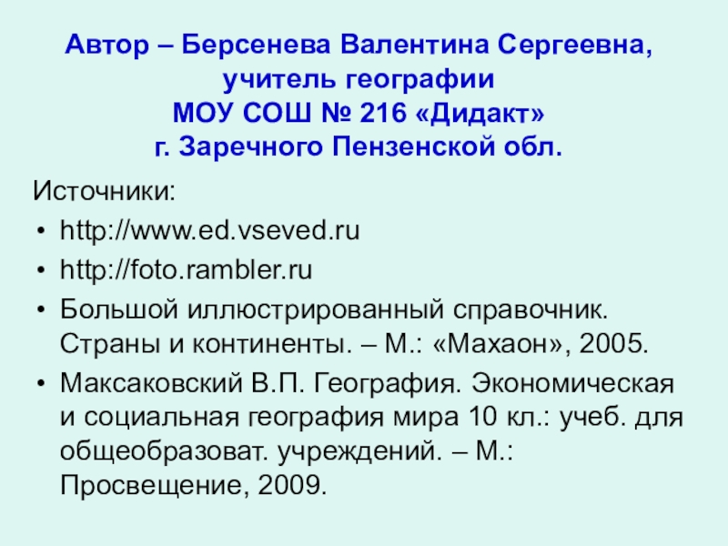 Автор – Берсенева Валентина Сергеевна,  учитель географии  МОУ СОШ № 216 «Дидакт» г. Заречного Пензенской