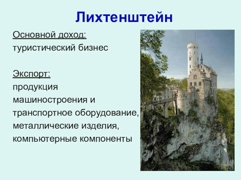 ЛихтенштейнОсновной доход:туристический бизнесЭкспорт: продукция машиностроения и транспортное оборудование, металлические изделия, компьютерные компоненты