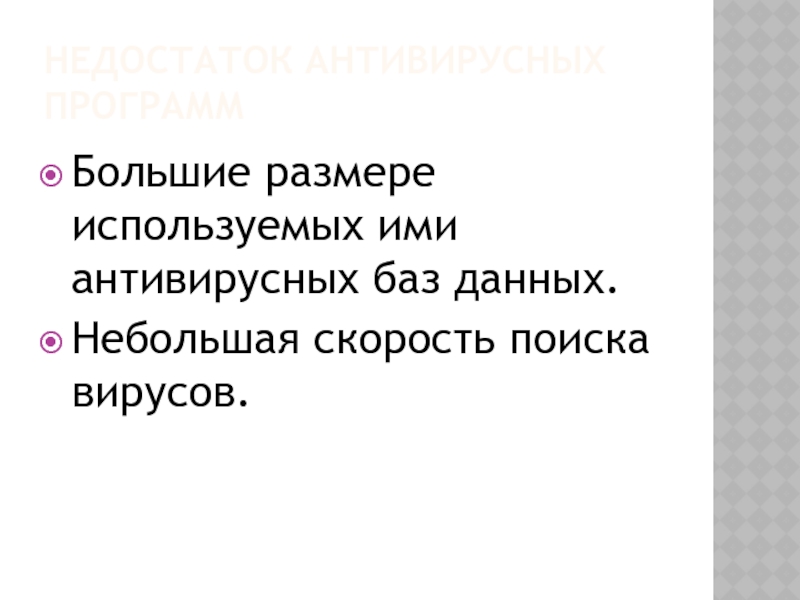 Недостаток антивирусных программБольшие размере используемых ими антивирусных баз данных.Небольшая скорость поиска вирусов.