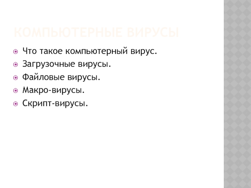 Компьютерные вирусыЧто такое компьютерный вирус.Загрузочные вирусы.Файловые вирусы.Макро-вирусы.Скрипт-вирусы.