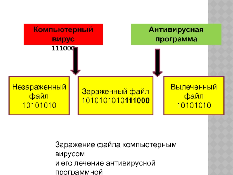 Компьютерный вирус111000Антивирусная программаНезараженный файл10101010Зараженный файл1010101010111000Вылеченный файл10101010Заражение файла компьютерным вирусом и его лечение антивирусной программной