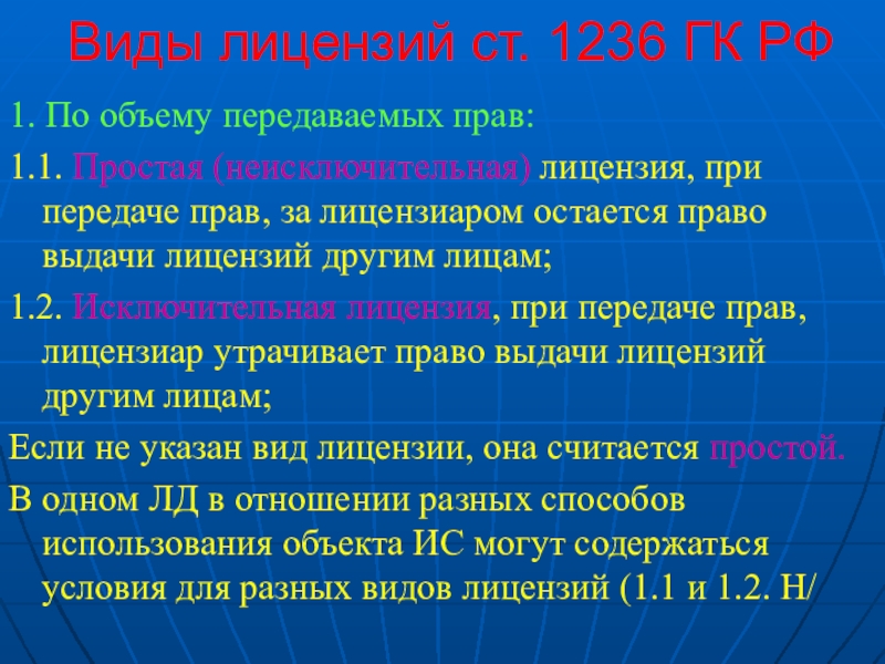 1.2. Исключительная лицензия, при передаче прав, лицензиар утрачивает право выдачи лицензий другим лицам;