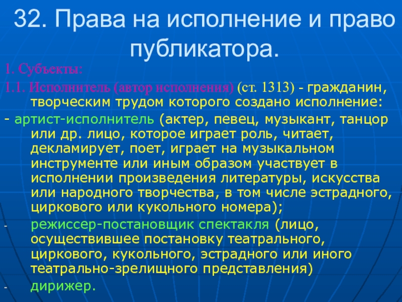 (автор исполнения) (ст. 1313) - гражданин, творческим трудом которого создано
