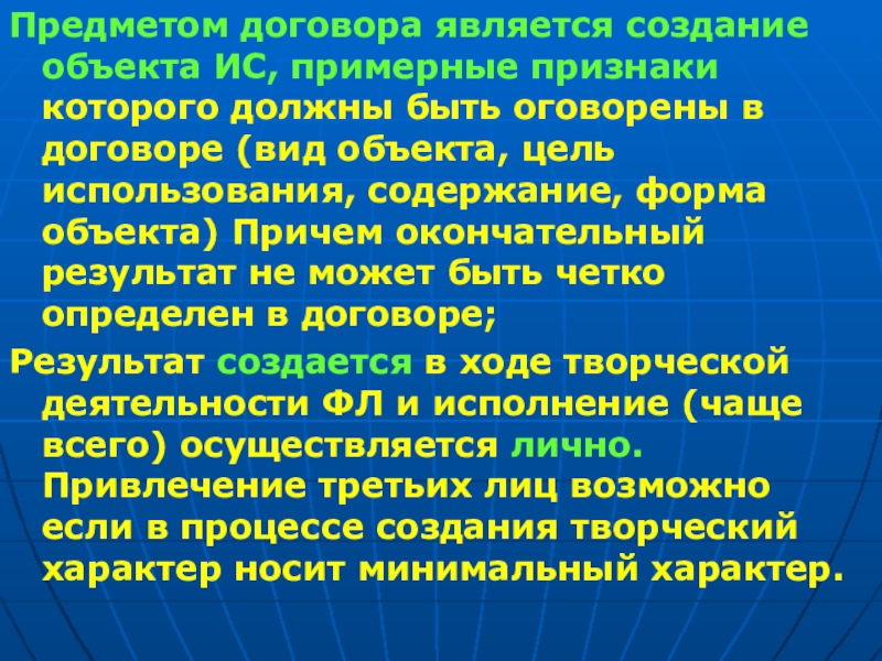 Слайд 38Предметом договора является создание объекта ИС, примерные признаки которого должны