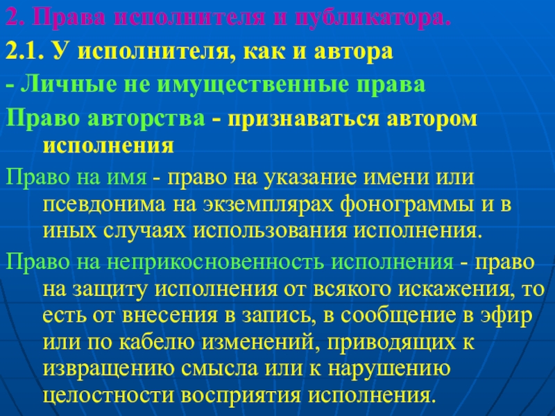 Право на неприкосновенность исполнения - право на защиту исполнения от всякого искажения, то есть от внесения в запись, в сообщение в эфир или по кабелю изменений, приводящих к извращению смысла или к нарушению целостности восприятия исполнения.